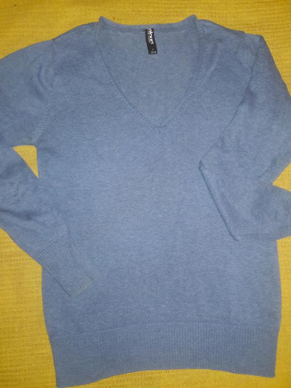 Свитер,цвет джинс.Приятный мягкий х/б трикотаж.V-образ. вырез.Смотрится стильно и сим патично.Длина 58см,плечи 34 см,грудь 43см,низ 36см резин ка,рукав 59см.Вырез интерес но подвернут - рулик. Указан разм.34/36 S. Если надо еще фото - дошлю.
