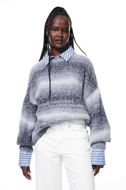 Светр з довгими рукавами з надм'якого жакардового трикотажу з круглим вирізом у рубчик і сильно спущеними плечима. Вільний крій. Манжети та поділ в рубчик