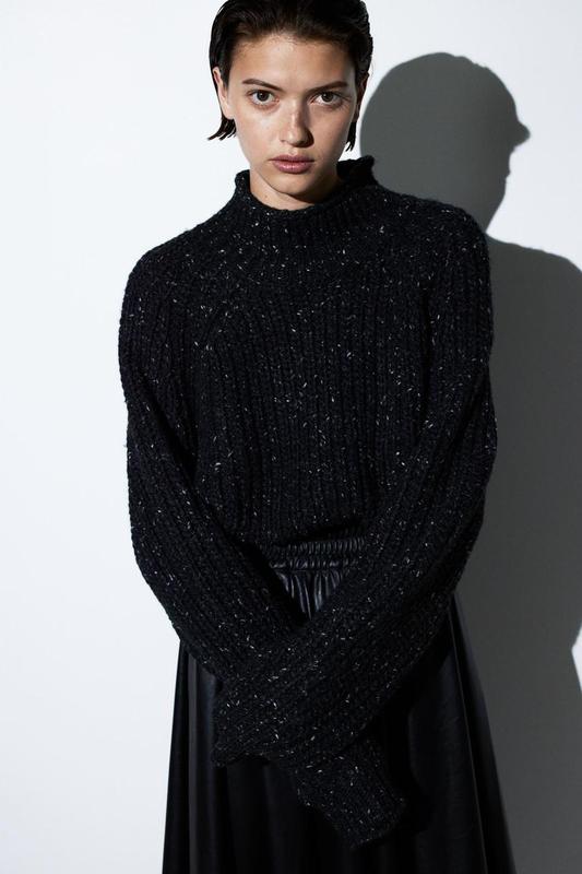 Пуловер из мягкого трикотажа с шерстью. Свитер имеет водолазку с окутанным краем, длинные широкие рукава реглан и широкие манжеты в рубчик с закатанными краями на рукавах и подоле.
