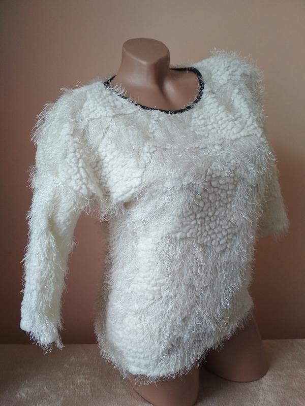 Женский свитер 44 размер, пушистик, замеры: плечи спущены 56 см, рукав три четверти 28 см, пог 50 см, пот 48 см, длинна спереди 55 см , сзади 65 см,