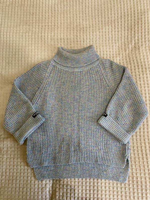 Різнокольоровий вʼязаний светр під горло. Светр має подовження по спинці. Довжина виробу спереду 52 см, ззаду 57 см, довжина рукава 50 см. Светр оверсайз. Пів обхват під руками 56 см.