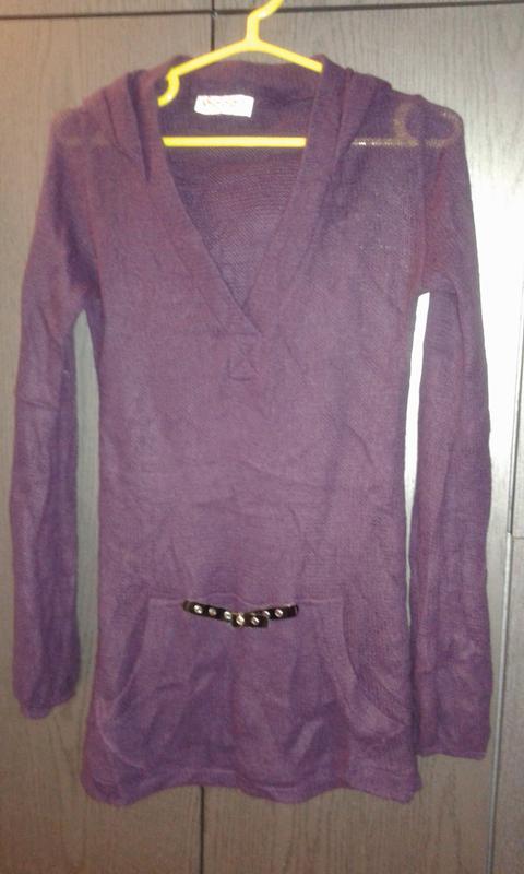 Тепла в'язана кофтинка-кенгурушка фіолетового кольору із капюшоном, р. S/M. Дуже класна , ніжна, приємна до тіла, кофточка. Заміри: довжина 76 см, ПОГ 43 см, ПОТ 37 см, ПОБІДИ 46 див. ( тягнеться )., довжина рукава 62 див. Реальний колір ближче до фото № 3,4
