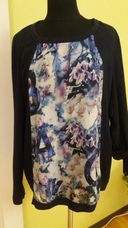 Стильная и удачного кроя.комбинированная кофта.лонгслив от немецкого бренда Сecil раз.16-18.Перед выолнен из цветной ткани шелковистой текстуры.бока и спинка однотонные.что создает вытянутый и стройнящий силуэт.Рукава трикотаж.Замеры ПОГ 57- 58 и ПОБ 58-61 длина рукава от горловины 71 Длина 66
