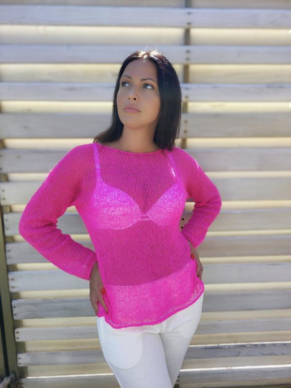 Необычайно нежный легкий свитерик паутин М мягкий пушистый абсолютно не колючий. Стильная модная вещь к вашему образу.Можная комбинировать с разной одеждой.Подойдет под шорты,джинсы юбка или платье. Состав: кид мохер/меринос/полиамид Связан из тонкой мягкой нити. Абсолютно не колкий, приятный к телу,теплый, напол прозрачный. Цвет в наличии розовый неон размер М/L Возможен повтор в другом цвете или размере. Срок исполнения 3-4дны На все вопросы ответь в дырект,дополнительные фото, замеры.