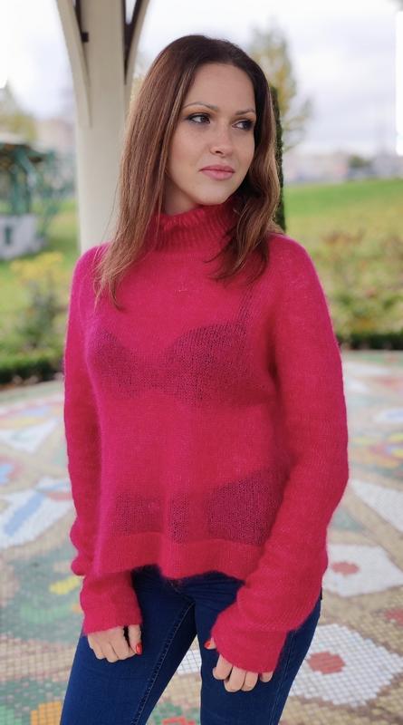 Роскошная паутинка связана с кид мохера на шелке 30% шовк 70%кид мохер,цвет яркая фуксия. Паутинка мягкая приятная на ощупь тепла.Связанная руками одним полотном без швов. Модель полупрозрачная,горловина имеет широкую резинку, изнанка удлиненные. Подойдет на размер L Ширина 54см Длина 53см рукава от подмышки 56см