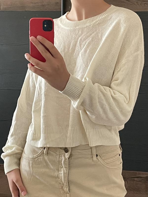 Свитер легкой вязки на теплую осень. Не оверсайз, но довольно свободный (фото 2). Рост на фото 175.
