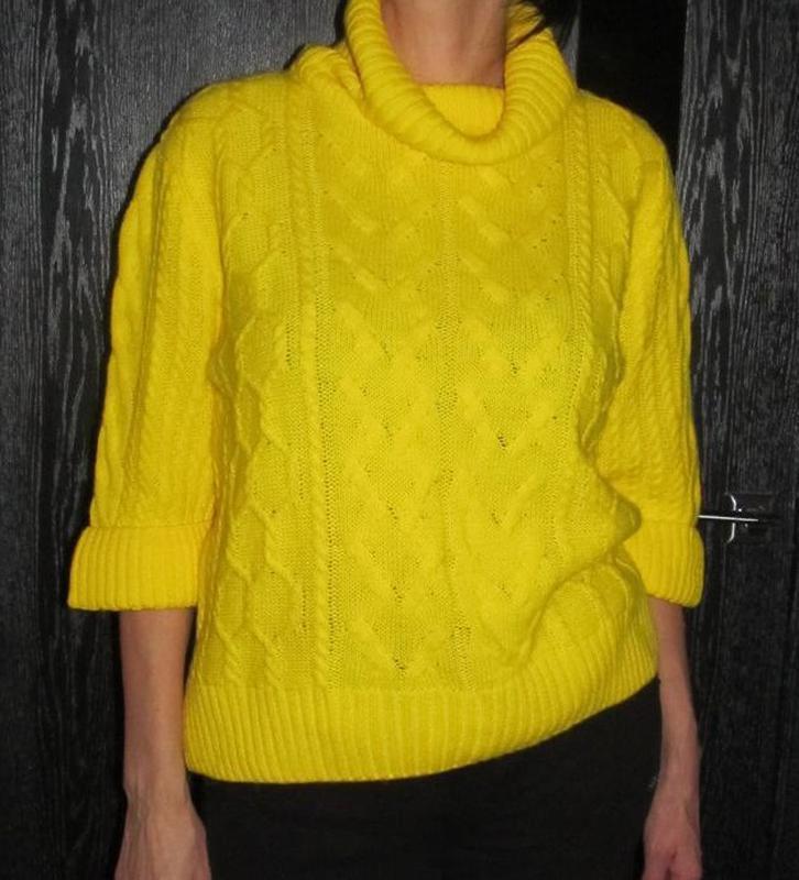 Яркий джемпер TU р. 18 смотрите замеры! красивый желтый цвет, узор косы по переду, рукав 3/4, высокий ворот. машинная вязка, Состав:100% акрил.Замеры: длина - 59см, пог - 70см, по низу 56см, рукав -40см. Стан - новый. Цена 350 грн.