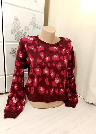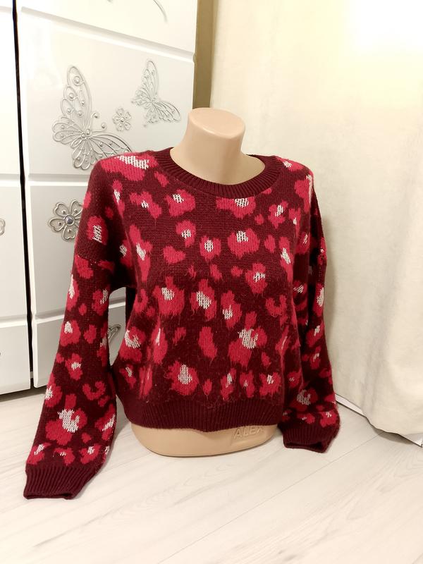 Светр укорочений широкий./ Primark. Цвет бордовый с красным белым. Размер указан S. Линия груди 57 см. Длина от плеча 50 см. Плечі+ рукав 73 см. Наличие катышек (пушистость).