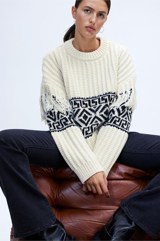 H&m свитер с этническим рисунком и кисточками Свитер жаккардовой вязки с добавлением шерсти. Свободный крой с круглым вырезом горловины, заниженной линией плеч и длинными рукавами с бахромой на плечевых швах. Ребристые манжеты и подол 50% полиэстер,45% полиакрил ,5% шерсть Демисезон в наличи ХС и С рамзер подойдет на М размер Цвет Молочный