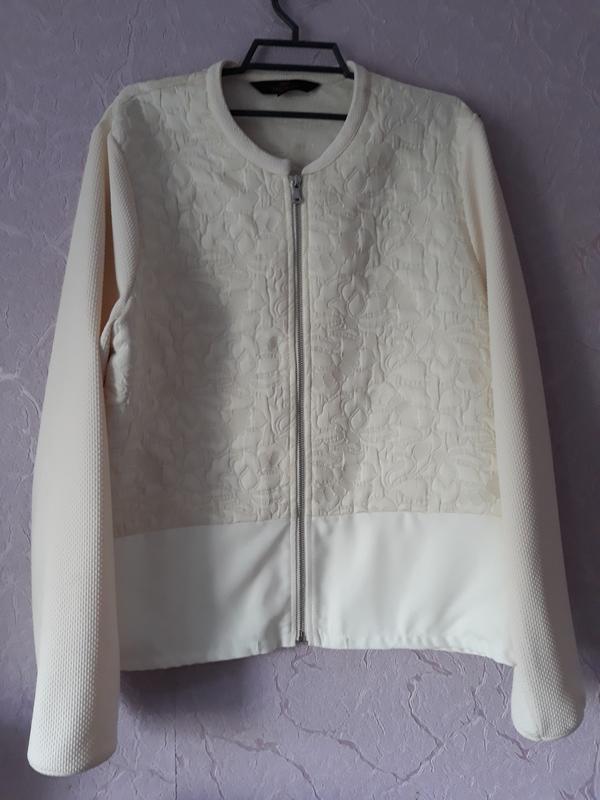 Красивый пиджак, размер 42. Длина 62 см, длина рукава 63 см, в груди 55 см. Производство Вьетнам. Есть один нюанс, нет внизу шнурка, но это поправимо).Цвет молочный