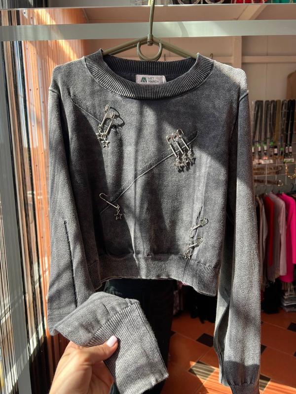 👆Вкорочений рваний светр в сірому кольорі з декоративними булавочками. Розмір універсальний XS/S/M Колір сірий виварений Булавки в комплекті ( знімаються ). Люкс якість. Приємний до тіла. ————- 🌹Заміри : Довжина 42см, довжина рукава від плечового шва 69см, груди напівобʼєм 47см