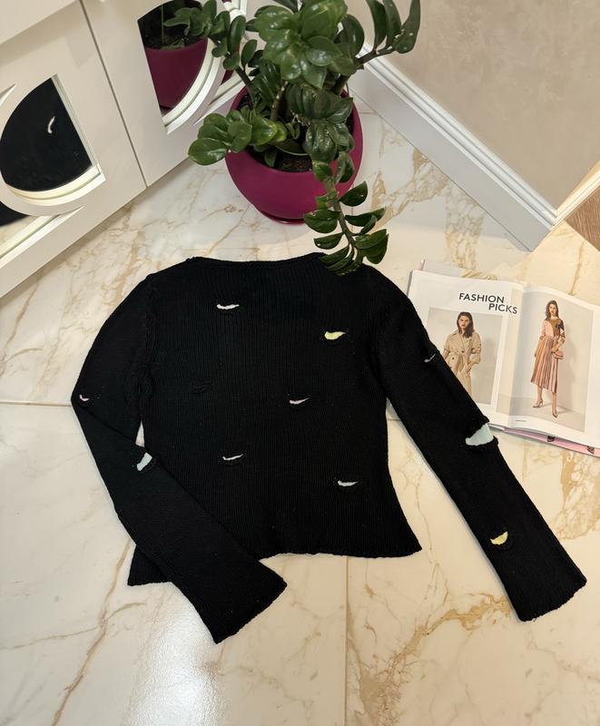 Женский свитер в размере S. Стан - идеальный. Состав: 90% хлопок, 10% вискоза (рхела вязка). Расклешенный рукав и декоративные разноцветные вставки.