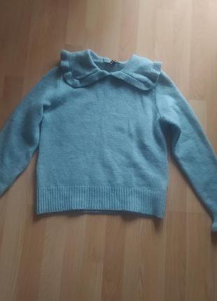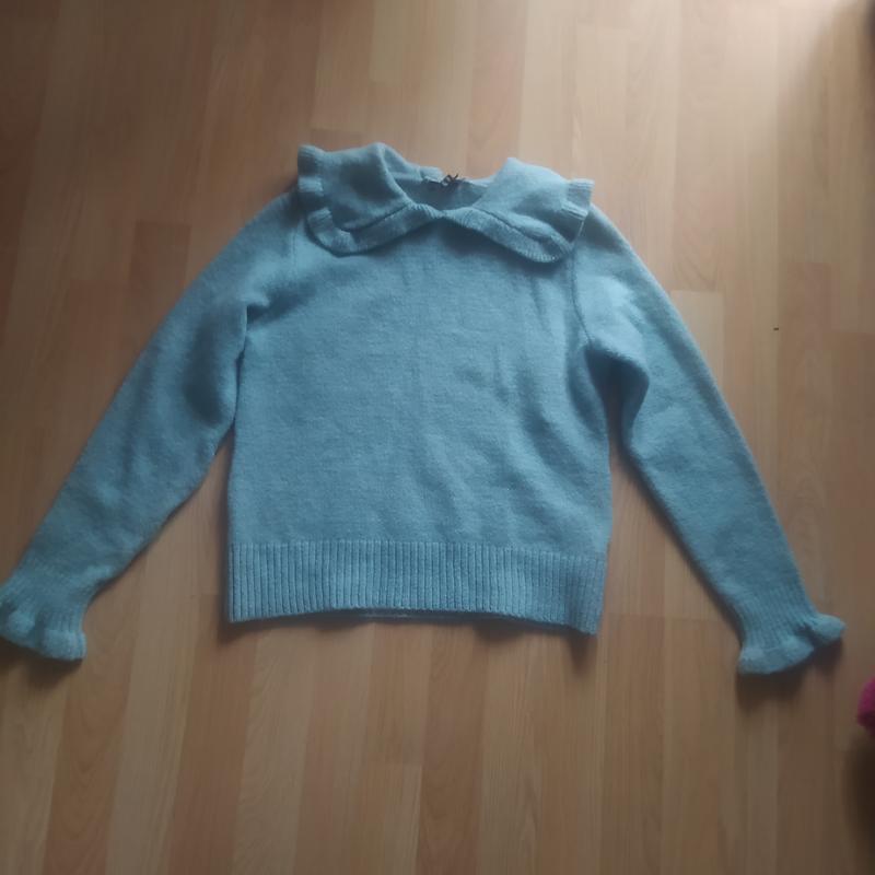 симпатичный , нежно голубой , теплый свитер с большим воротником, ткань мягкая ,хорошо тянется , плотная .цвет не однотонный с небольшими вкраплениями . Смотрится примерно как на фото с девушкой . Пог 50 см , добре тчгнеться , довжина 55 см плечи 40 см , рукав 55 см