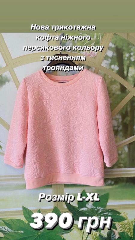 Нова трикотажна кофта ніжного персикового кольору, дуже приємна на дотик, тканина з тисненням трояндами, рукав 3/4, розмір XL (наш розмір 50).