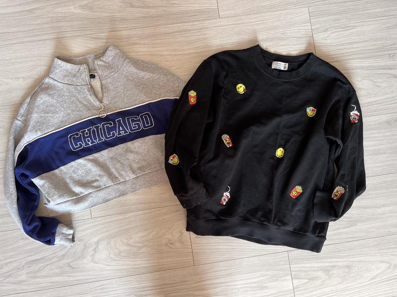 Цена за один. Черный с нашивками - нашивки не приклеены, а прочно прошиты. Серая кофта укороченная.