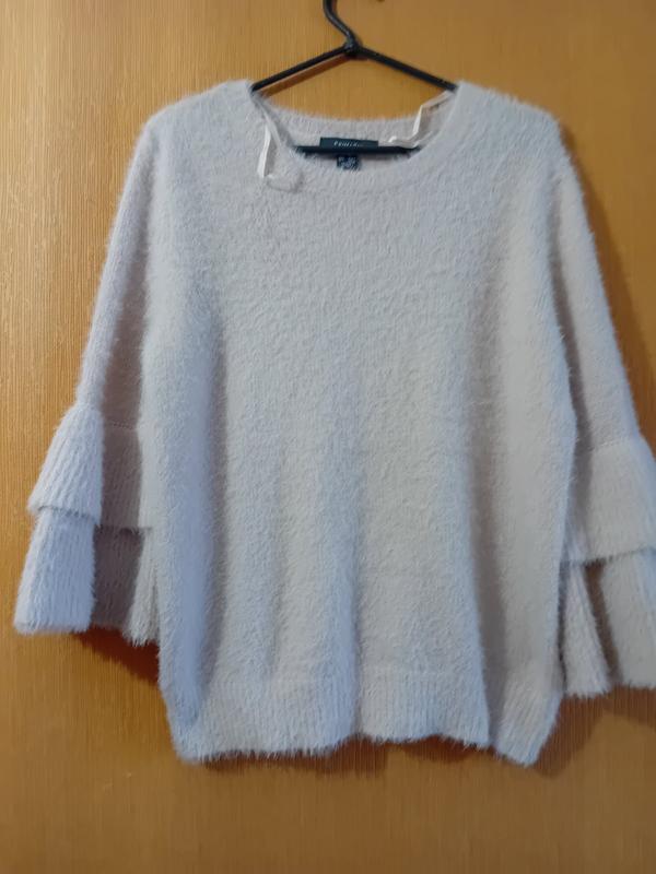 Свитер пудрово розового цвета травка 67 полиамид, 33 акрил. Оверсайз, красиво оформлены воланами укороченные рукава. Плечи 40, грудь 50, длина 60, рукав 45