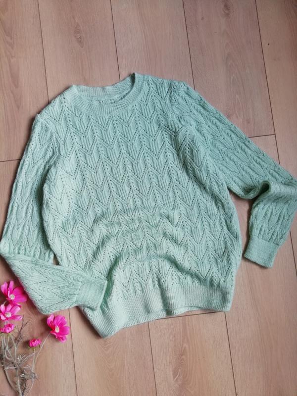 Нежный мятного цвета джемпер. Размер указан 12, 14/XL L. Ориентируйтесь на замеры. Длина свитера 60 см. Полуобхват груди 54 см. Полуобхват низа (резинки) 45 см. Плечи 38 см. Длина рукава от плеча 65 см. Состав 73%акрил 27%полиэстер. Состояние идеальное. Без каких либо нюансов. Фото на теле нет.
