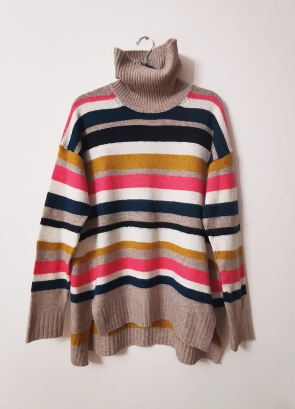 Полосатый свитер мультиколор, размер М. Длина 60/65, пог 51, поб 54, рукав от горловины 69, акрил + полиэстер.