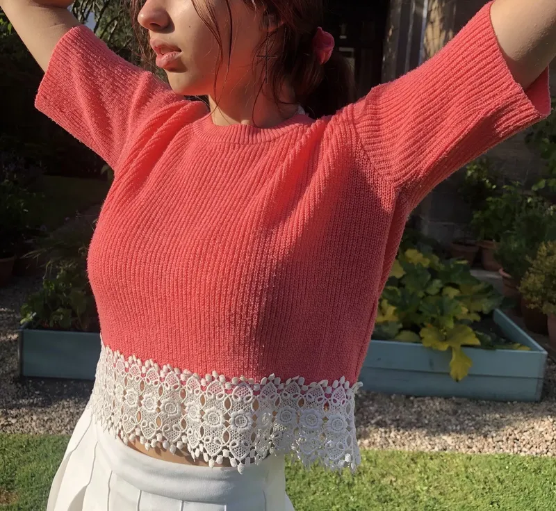 Вязаный укороченный топ TOPSHOP персиково-розового цвета укороченный свитер с кружевной отделкой размер евро 40, англ 12 на наш 44-46-48 Ширина (по груди) - 56см Ширина (по талии ) - 52см Длина - 51см Состав: 100% - акрилик