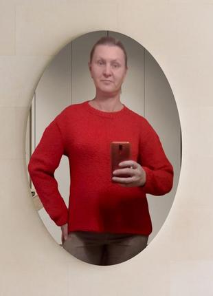 Длина 57 см, ПОГ 60 см, по низу 68 см, плечи 49 см, рукав 62 см. Пряжа: 47% хлопок, 53% полиакрил. Ручная вязка спицами, модель с расширенным низом. Теплий светр. Цвет красный. Подходит на размер от 46 до 50.