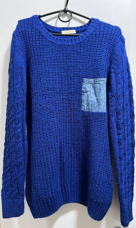 Синий свитер в размере М Длина по спине - 66 Полуобхват груди - 48 Вязаный, синего цвета LedTeks