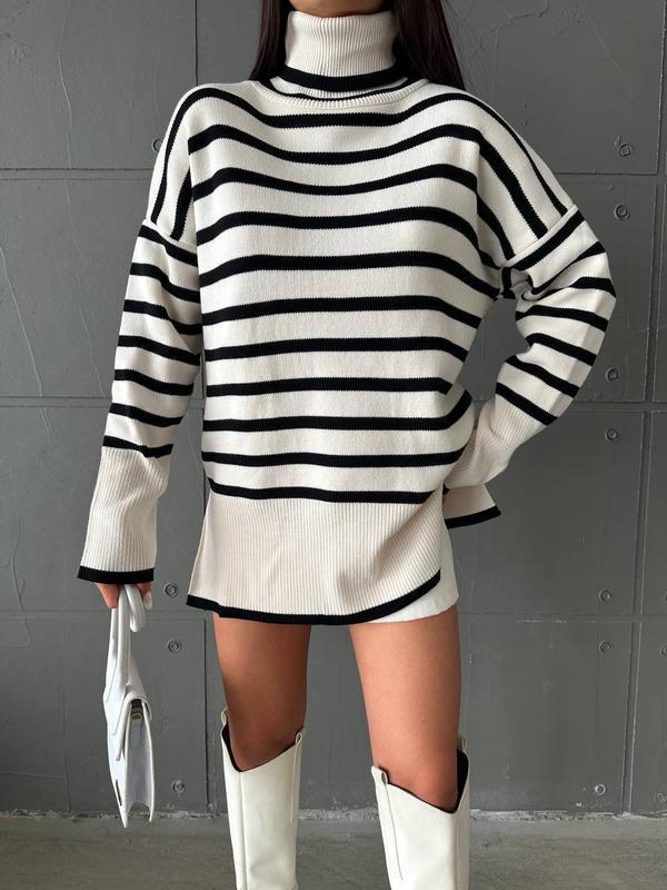 Новинка Ваш любимый свитер в большом количестве и всегда актуальный 👍 Удлиненный полосатик под горло с разрезами по бокам хит продажи 2023 г💎 Отличное качество 🇺🇿приятная к телу # 0181 🫶Реал фото👌 ▪️Производитель Турция ▪️Цвет черный и белый ▪️Размер единый 42-46 ▪️Состав Акрил 70%, Шерсть 30%