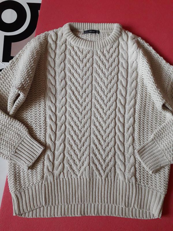 Класний светр zara knit відомого бренду.Колір світлий беж.Перед в'язка косами. Плечі трохи спущені Пог 58+ По низу 46+ Рукав від горловини 64 Довжина перед 56 спинка 60. Акріл. Нова,укрпошта.