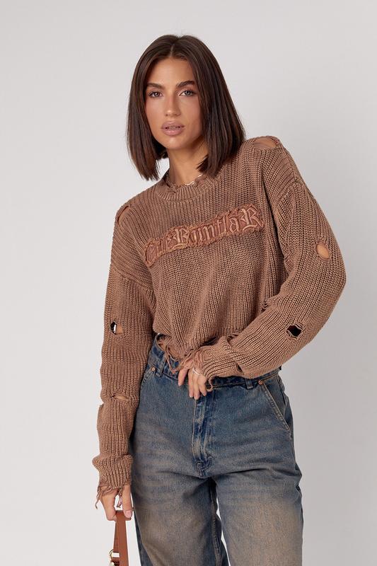 Коротка в'язана кофта з рваними елементами - коричневий цвет, l (є розміри)