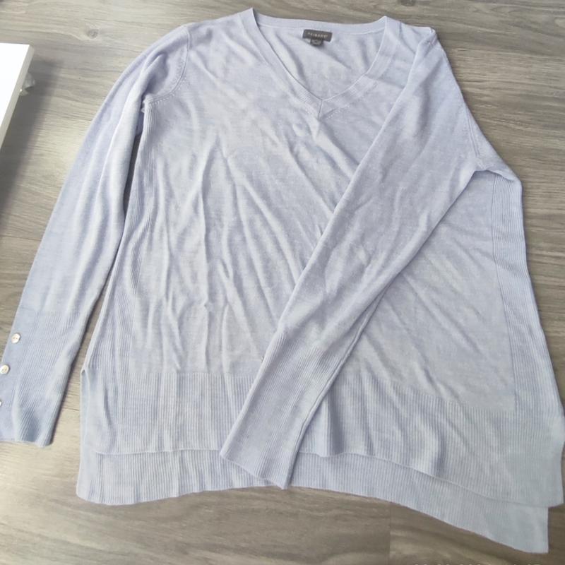 Женская кофта голубого цвета, размер М, имеет по бокам разрезы, сперед короче сзади