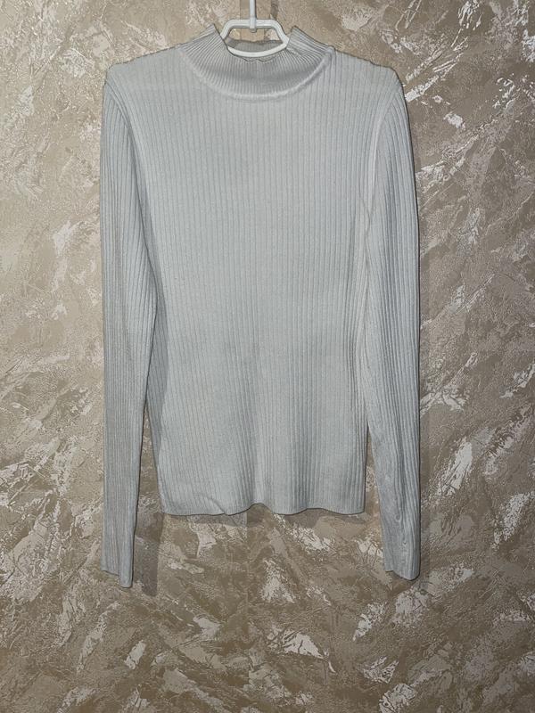 Белый свитерик в рубчик. Гольфик, водолазка. Можно носить под пиджак. Состав - 70% вискоза, 30 - нилон. Замеры: длина - 54 см, плечи и низ 33 см, грудь - 35 см. тянется.