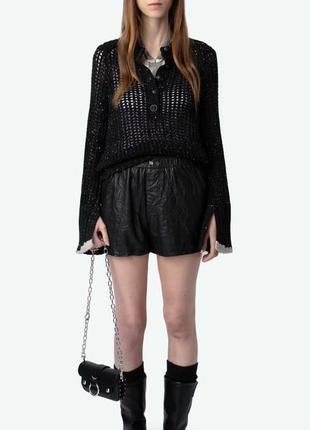Женский черный вязаный сетчатый свитер - Блеск - Круглый воротник с застежкой на пуговицы - Слегка расклешенные длинные рукава, разрезные манжеты с контрастными вышитыми краями и ребристыми краями