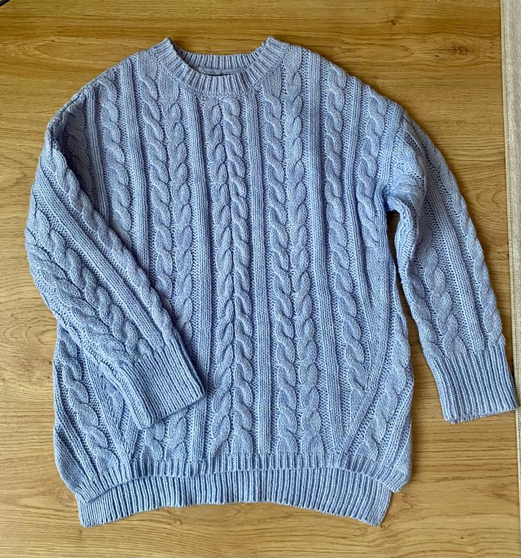 Свитер нежно голубого цвета в идеальном состоянии. Длина 56, сзади 60, ширина под руками 51, длина рукава 62 от шеи, от плеча 45( плечо спущенное). Состав на фото, цвет как на фото 4