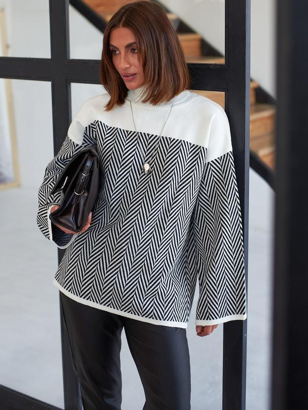 Оверсайз свитер из высококачественного турецкого материала. Изделие с узором "елочка". Длинные рукава со спущенной линией плечевого шва. Модель с высокой горловиной, выполненной резинкой. Размеры: 44-50 (единственный) Доставка: 💙 Укрпошта (повна передплата) 💛Нова Пошта ✨Отправка 2-3 рабочие дни 🌿Есть возврат и обмен