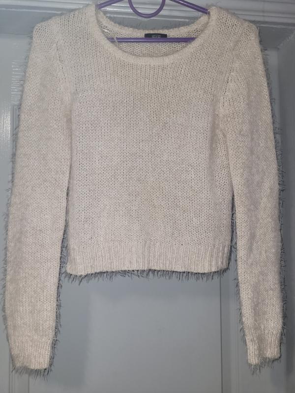 Укорочений светр, молочного кольору. замеры: Длина рукава от плеча 62 см Длина изделия по спинке 42 см Полуобхват груди 40 см