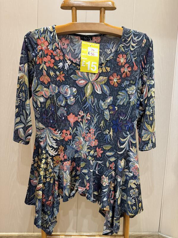 В наличии красивая кофточка фирмы C.M.D. Размер указан 14, но по замерам лучше будет на 12. Состав: 95% полиестер и 5% эластана..ткань очень мягкая и приятная к телу, хорошо тянется. Полуобъём в груди - 50 см и ещё тянется до 55 см Длина - 67 см, по бока немного длинней Плечи - 39 см Длина рукава - 43 см Полуобъём в бедрах - крой свободный