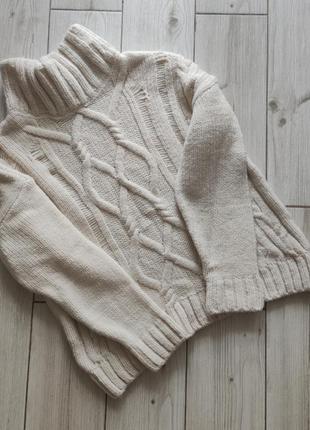 Теплый, вязаный свечер с плетеным узором. Объемное горло заменяет шарф. Кофтина отлично подходит для холодной зимы. Подходит к брюкам, юбок и лосин.