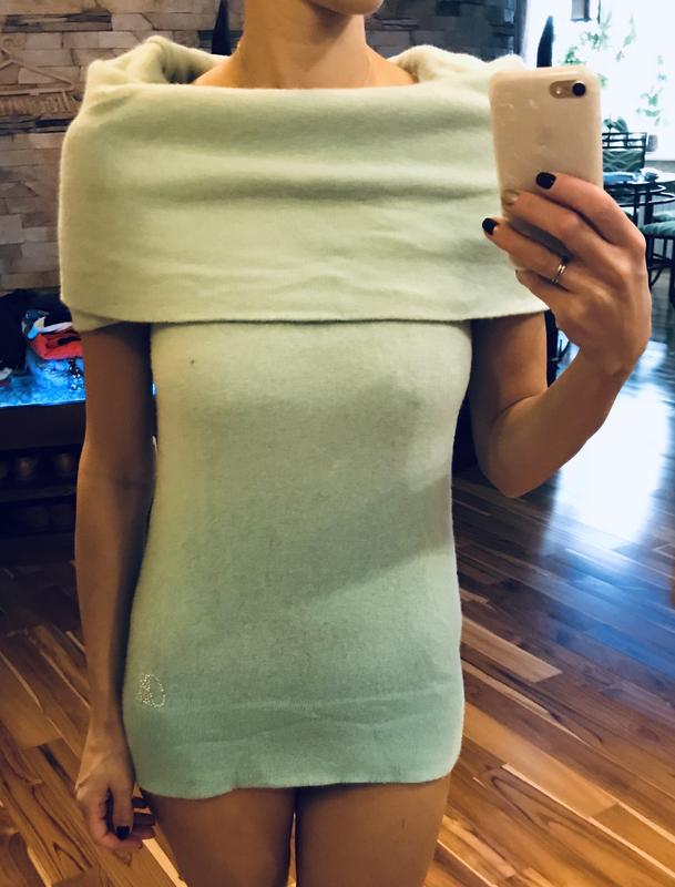 Очень теплый шерстяной свитер Одела 1 раз Без следов носки Горловину можно выкладывать по разному Длина 61 Под мышками 41 ( на фото одет на парам 84-64-92) Нежный мятный цвет, сбоку отделка стразами сваровски