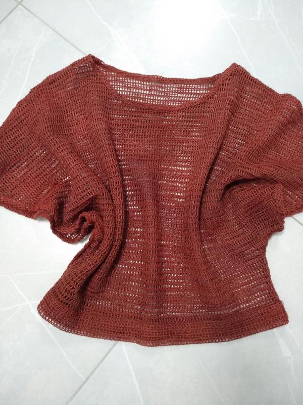 кофта свитер сетка кроше с интересной вязкой. Полуобъем в груди и талии свободно крой летучая мышь, полуобъем в поясе 54 см длина 57 см Цвет терракотовый