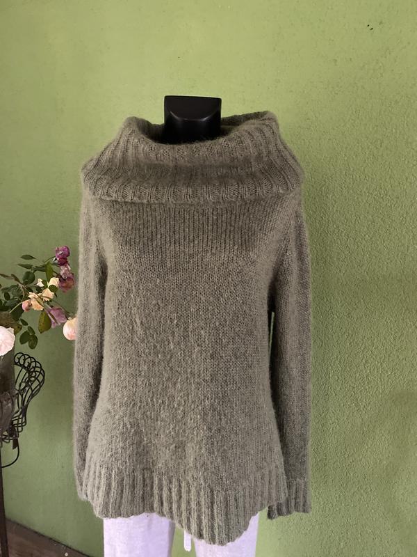 Теплый свитер с высоким и широким горлом зеленого цвета. Состав:мохер/акрил/полиэстер (58/25/27). Размер по набору-L. Замеры: длина-64 см, ПОГ-50 см, ПОБ-50 см, рукав-65 см. Горловину можножно формировать по Вашему желанию.