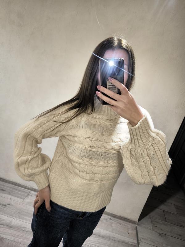 Очень красивый, стильный свитерик, с добавлением люрексной нити, с объемными рукавами, в нежном бежевом цвете, мягенькая приятная к телу ткань. Размер С М