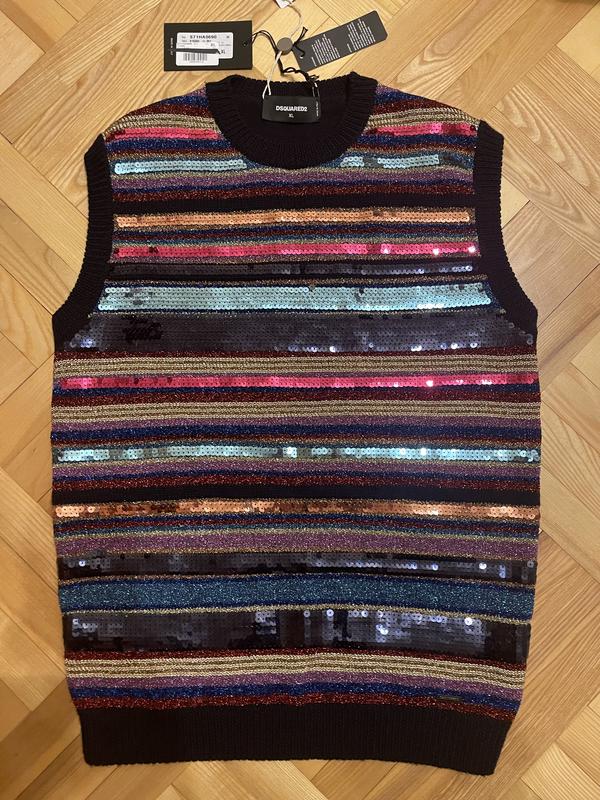 Новый жилет свитер Dsquared2 из мягкой шерсти Dsquared2, оригинал, самая нежная мериносная шерсть (полный состав на фото), размер маркирован XL, будет как оверсайз на С-М и по фигуре на L-XL. Замеры: длина - 72 см, ПОГ - 52 см. На рост 166 см (на фото) садится как мини-платье или с длинной рубашкой под низ и под лосины или плотные колготы. Стоимость на сайтах более 500 $, везде sold out...