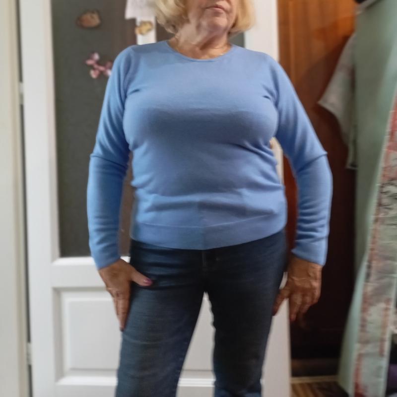 Предлагаю великолепный новенький голубой свечерок, 100%-акрил, размер 14, но примеряю на 16,мени комфортно. Замеры: ПОГ-54, Длина -62, рукав-60, плечи -37.