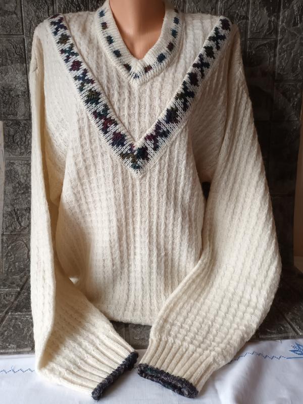 Артикул М08 Свитер в отличном состоянии, объёмный, тёплый, плотная вязка, тянется, бирок нет. Дефектов нет. По составу шерсть, акрил. Слегка покалывает. Плечевой шов приспущен. Замеры сняты в спокойном состоянии изделия. 📌 Замеры - плечо по шву 22 - длина рукава 63 - длина по боковому шву 43 - длина по спинке 76 - полуобьем по груди 53. 📦 Отправка новой почтой и укрпочтой при оплате на карту. Наложенного платежа нет.