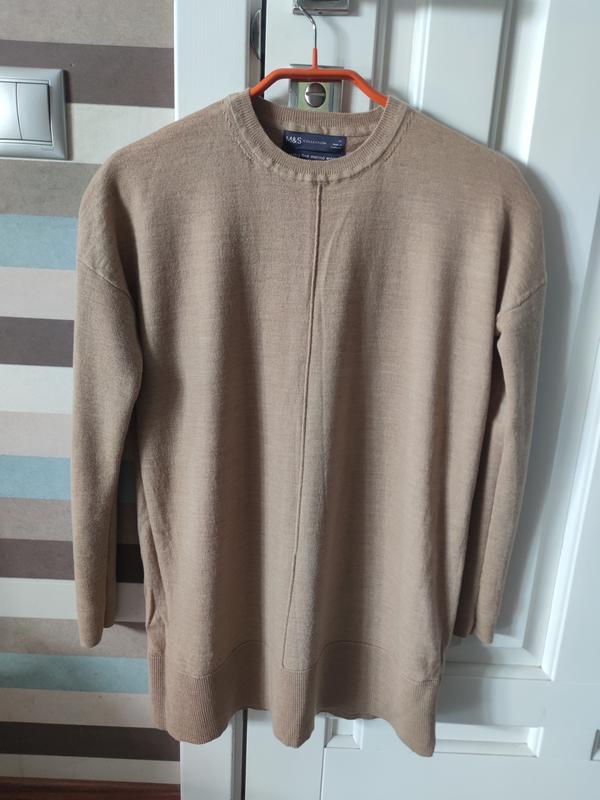 Женский свитер Marks and Spercer, XS. 100% шерсть мериноса. Стан - идеальный Цвет кэмэл, камера не передает. Самый приближенный к реальному на 4м фото. Очень красивый и качественный. Можна на S. Полуобхват груди 47см, длина рукава от горловины 62см, длина по спинке от горловины 66см