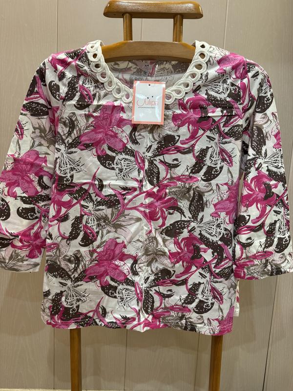 В наличии красивая кофточка фирмы JULIPA. Размер указан 16. Состав: 100% котон, ткань мягкая и приятная к телу, хорошо тянется. ПОГ-57 и ещё тянется, длина-63, плечи-40, длина рукава-48, ширина по низу-55 и ещё тянется.