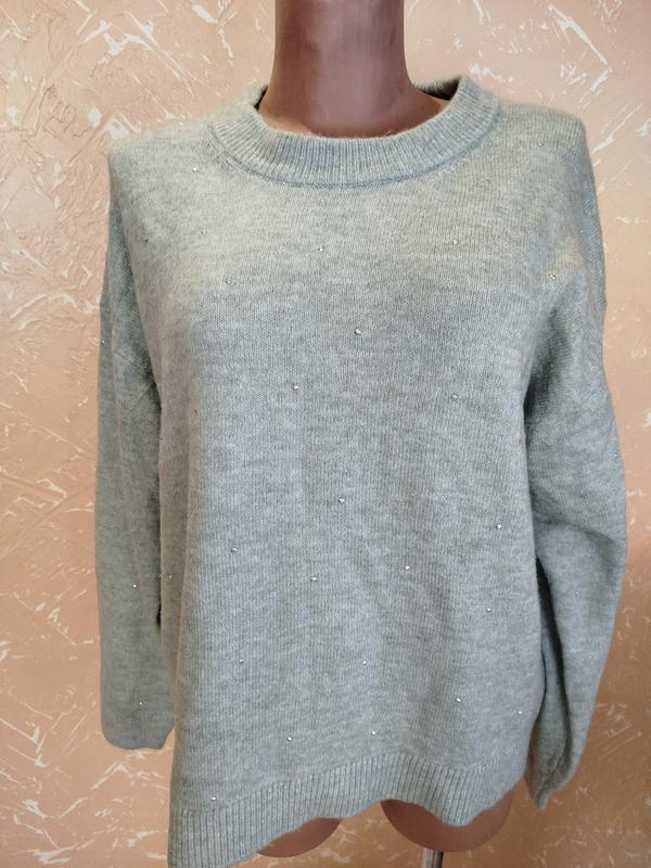 М'який светр тонкої в'язки з вмістом вовни. Імітаційна водолазка, сильно спущені плечі та довгі рукави. Резка на горловині, манжетах і подолу. Розмір: М.