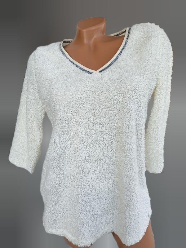 Очень красивая мягкая кофточка. Три четвертых рукав. Красивый вырез на горловине. Вид новой, без дефектов. Страна производитель Турция Ткань 100% полиэстер Длина изделия по спине 63 см Длина рукава 40 см Полуобхват грудей 51 см Полуобхват талии 52 см