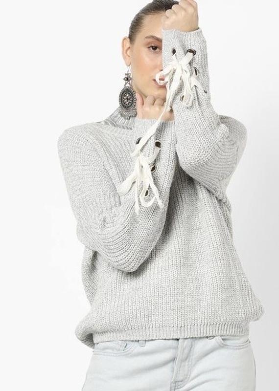 Свитер с декоративными завязками на рукавах Нежно серого цвета Классная модель,гарная машинная вязка Стан - идеальный Нужно замочить, чтобы разровнился Размер м/подойдет на л Длина 56/зад 60 Пог 66 Плечи опущенные 74 Рукав 46