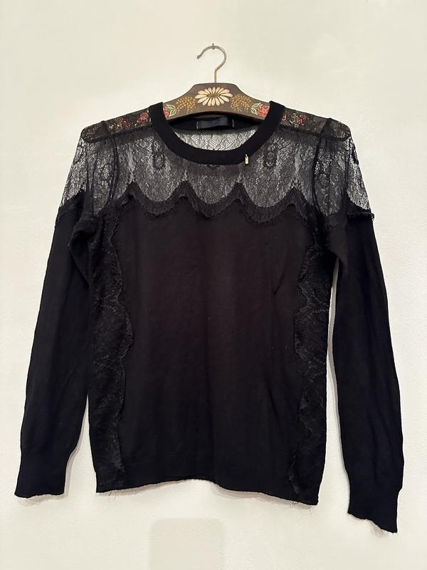 Стильна кофтинка з ажурними вставками. Всі Бірки,з мікро дефектів-невелика затяжка ззаді(біля шва,в носінніневидно. Розмір вказаний,гарно підійде і на інші розміри,тканина тягнеться. Довжина від плеча 60 Плечі 37 Рукав 62 Пог 44-54 Пот 44-56 По низу 42-54