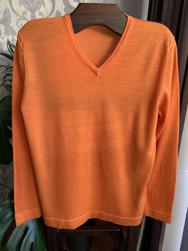 Женский джемпер скандинавского бренда, выполненный из 100% шерсти мериноса. Мягкий и уютный, в меру тонкий, но хорошо согревающий, очень комфортный к телу. Цвет оранжевый, причудлив не такой яркий, более спокойный, чем на фото. Джемпер в безупречном состоянии. Замеры: ширина в груди 110см, в талии 104см, внизу 104см, рукав 67см, длина 73см.